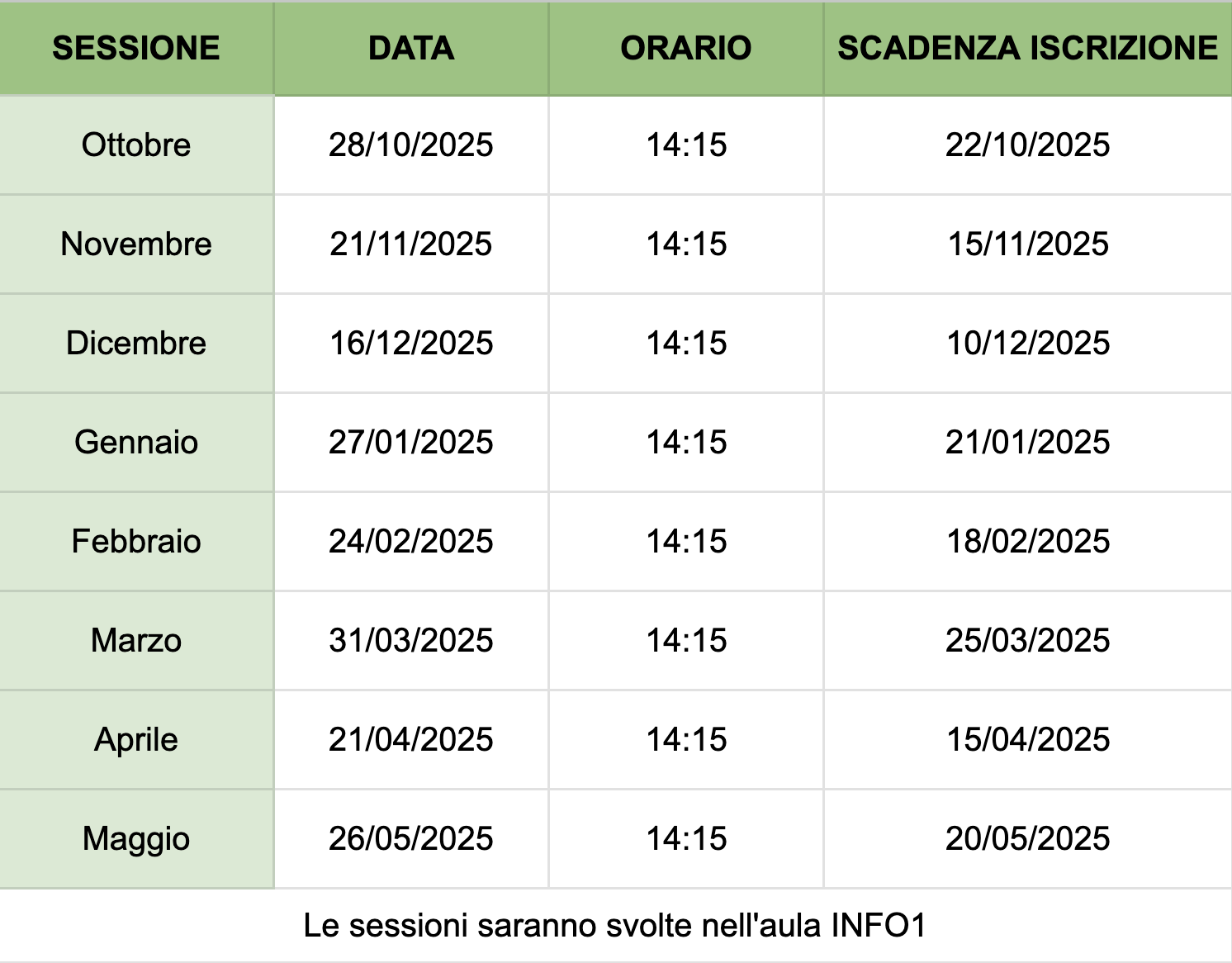 - PAGAMENTI: a partire dal 01/01/2025, i pagamenti per le skill card e gli esami non avverranno più mediante pagamenti spontanei. Nello specifico, una volta compilato il modulo Google di iscrizione al singolo esame, gli iscritti riceveranno via mail (all'indirizzo inserito in fase di iscrizione) una richiesta di pagamento PagoPa con l'importo da pagare. Tale pagamento dovrà essere completato entro la data dell'esame.